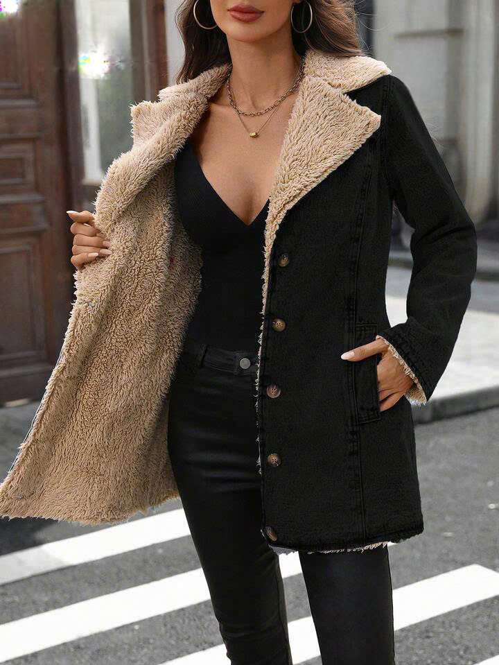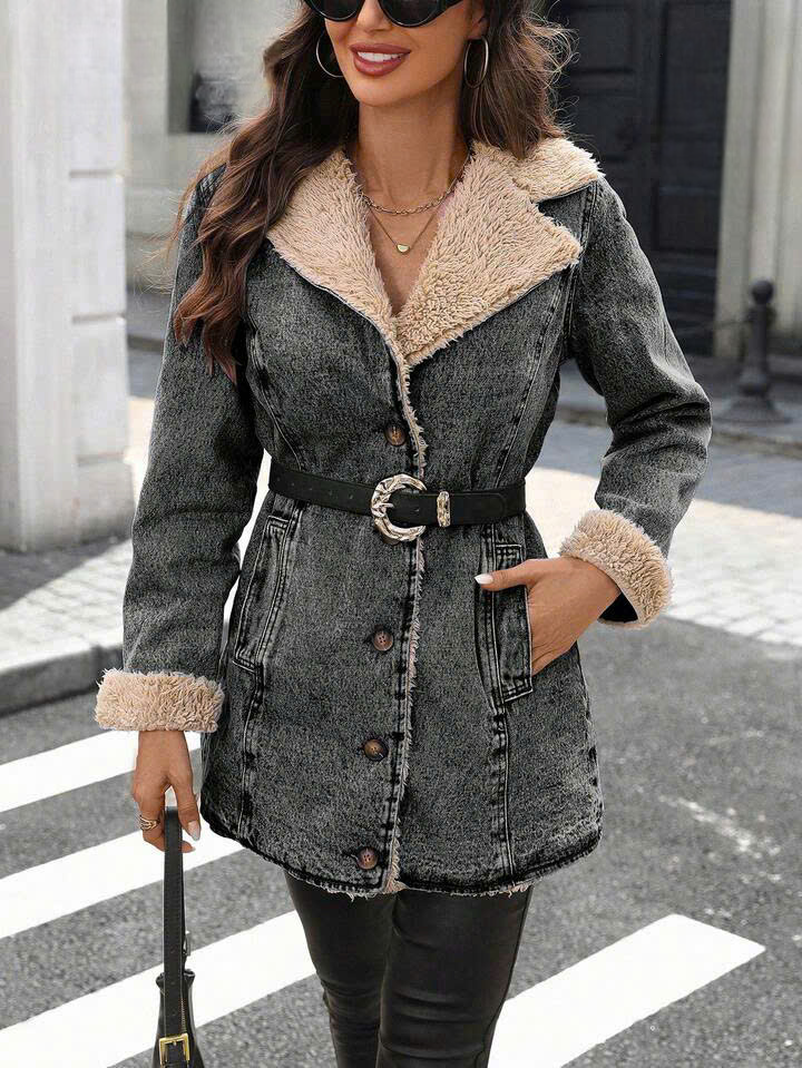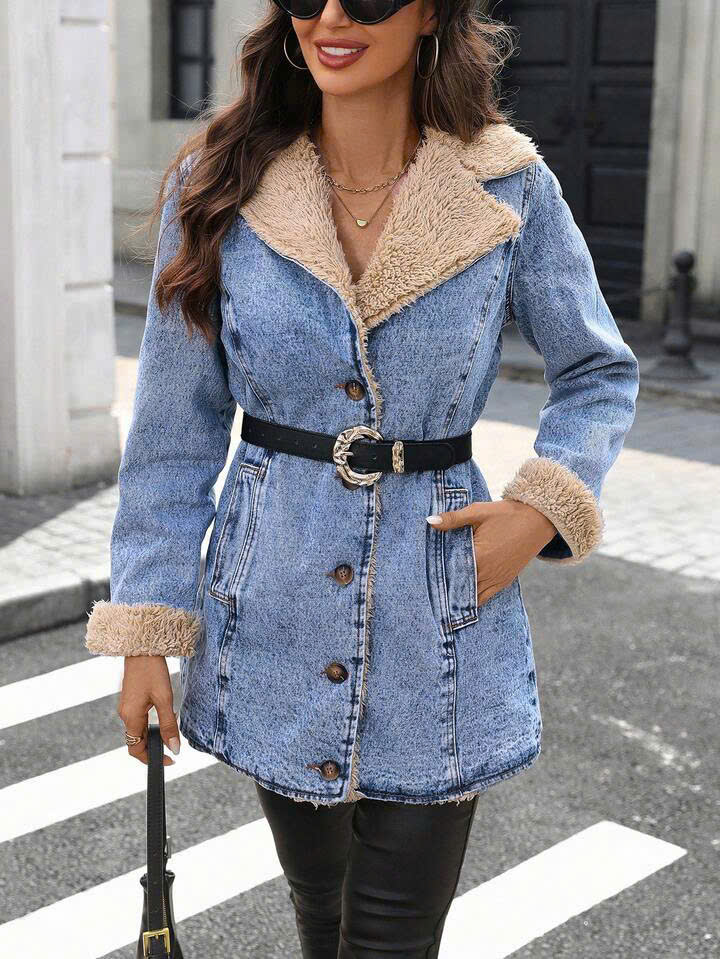 Women’s Faux Shearling Lined Denim Jacket with Belt – Button Front Winter Jean Coat